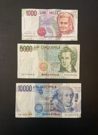Tre Banconote Lira Italiana: 1000, 5000, 10000