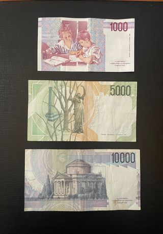 Banconote risalenti agli anni '80-'90. 1.000 Lire "Maria Montessori", pedagogista italiana. Emessa dal 1990 e ultima versione del taglio da 1000 lire prima della cessazione del corso legale. Sul retro raffigurato il dipinto "Bambini allo studio" 5.000 Lire "Vincenzo Bellini" compositore catanese. Sullo sfondo del dritto l’interno del Teatro Massimo Bellini di Catania, sul retro scena dell'opera lirica "Norma". Emessa in diverse serie dal 1985. 10.000 Lire "Alessandro Volta", l'inventore della pila. Accanto al ritratto c’è uno strumento di laboratorio, sul retro c’è il Tempio Voltiano di Como. In circolazione dal 1985 al 2002