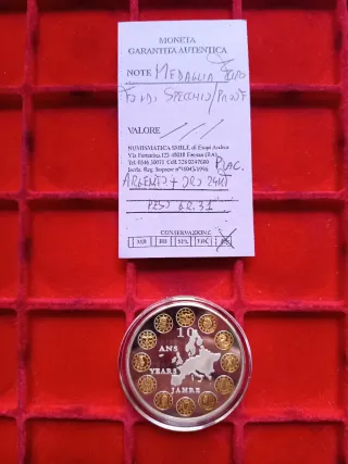 Medaglia commemorativa per i dieci anni dell'euro (2002-2012) Proof placcata argento + oro. Medaglia commemorativa che celebra i dieci anni dell'Euro, con una mappa stilizzata dell'Europa al centro. - Design circolare con 12 piccole medaglie. - Ogni piccola medaglia raffigura un simbolo o un ritratto.