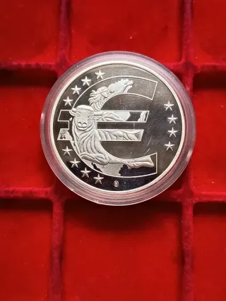 Medaglia commemorativa FDC dell'Estonia del 2002, dedicata all'introduzione dell'Euro. - Dritto: raffigura un edificio storico con la scritta EESTI e simboli di monete. - Rovescio: presenta un edificio con la scritta 1. JAANUAR 2011.
