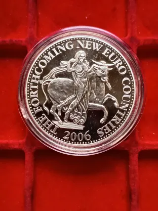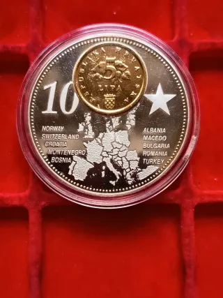 Croazia medaglia commemorativa da collezione che rappresenta l'estensione dell'Eurozona, raffigurante una mappa d'Europa con paesi non ancora membri dell'euro al momento della coniazione. Tema: L'adesione di futuri paesi all'Eurozona. Caratteristiche: Mappa dettagliata con nomi di paesi come Norvegia, Svizzera, Croazia, Montenegro, Bosnia, Albania, Bulgaria, Romania e Turchia. Moneta sovrapposta: Una piccola moneta da 5 Lipa è posizionata sulla medaglia principale. Materiale: Moneta placcata in argento e oro. Medaglia commemorativa della Croazia con il valore di 10 Euro.
