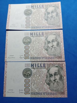 Vendo tre banconote da 1000 lire italiane. Sono in Fds fior di stampa - Tre banconote da 1000 lire. - Banconote della Repubblica Italiana. - Ottime per collezionisti.