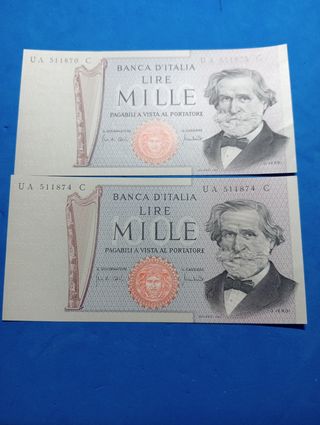 Due banconote da 1000 lire Giuseppe Verdi 2 tipo della Repubblica Italiana. Sono condizioni Fds fior di stampa come mostrato nelle immagini. - Banconote originali - Valore facciale: 1000 lire - Due pezzi