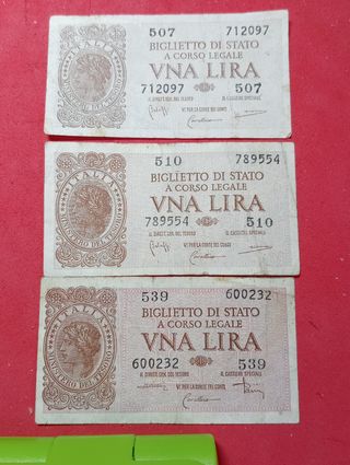 Tre banconote del Regno d'Italia da una Lira. - Banconota 1: 477 - Banconota 2: 523 - Banconota 3: 539