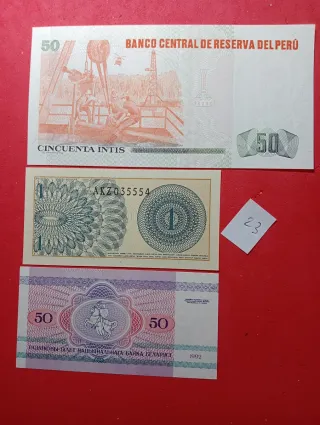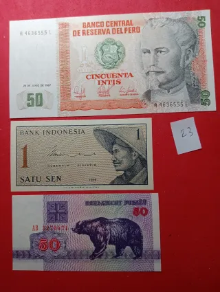 Lotto di tre banconote da diversi paesi. - Banconota da 50 Intis, Perù, 1987. - Banconota da 1 Satu Sen, Indonesia, 1964. - Banconota da 50 Rubli, Russia.