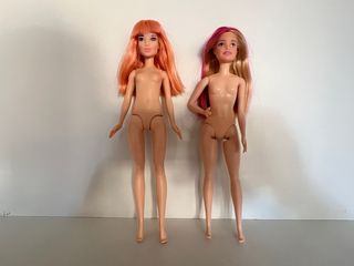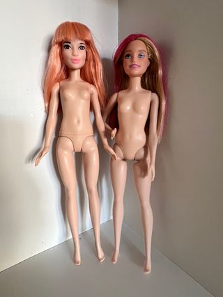 Lotteria di due bambole Barbie (smontate). Sono in buone condizioni ma presentano alcuni segni d'uso. - Una bambola con capelli biondi e sfumature rosa. - Un'altra bambola con capelli arancioni e frangia.