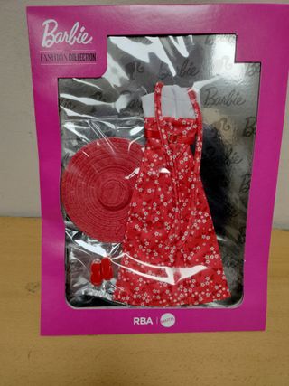 Set di moda per Barbie della collezione The Fashion Collection. Include: abito rosso con stampa floreale bianca, cappello a falda larga abbinato, scarpe rosse, blusa bianca.