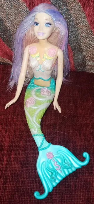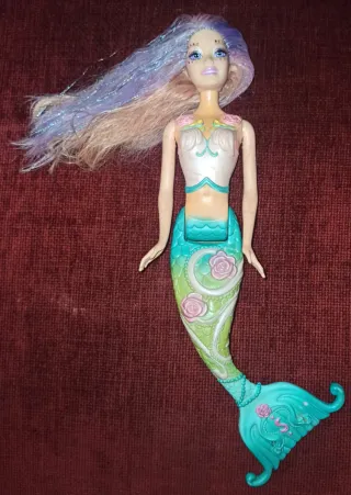 Bambola Barbie con coda da sirena. Coda da sirena con design a squame e fiori. Costume da bagno con dettagli. Capelli lunghi e ondulati con sfumature colorate. USATO CON SEGNI DI USURA PER SOLI 4€!! PREZZO FISSO SENZA RESO