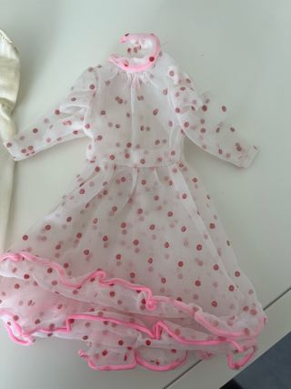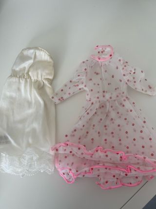 Set di abbigliamento per bambola Barbie della collezione Nizza di Congost. Barbie Spagna Include due pezzi. - Vestito bianco con pizzo sul fondo. - Vestito trasparente con pois rosa e volant, manca una gonna sul collo
