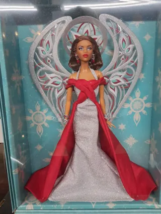 Barbie Bob Mackie Holiday Angel. - Abito argentato brillante con dettagli rossi. - Ali decorative argentate. - Orecchini e bracciali abbinati.