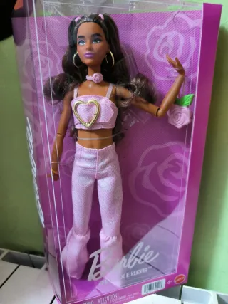Barbie Deluxe Style con un abito moderno. - Abito a due pezzi in rosa. - Dettaglio a cuore dorato sul top. - Pantaloni a campana con stampa. - Include accessorio a fiore rosa.