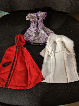 3 Vestiti Barbie anni 80: una pelliccia lunga con etichetta Barbie Fashion, una mantella rossa senza etichetta, un vestito estivo senza etichetta. Tutti in ottime condizioni.