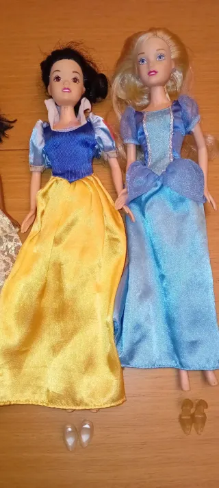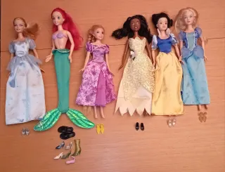 Set di 5 bambole Principesse Disney e Barbie, con abiti Barbie utilizzabili da tutte le bambole. Tutte hanno i loro vestiti originali. Ci sono scarpe per tutte tranne che per Ariel e includo tutti i pezzi singoli che ho e alcuni di Kent. Tutti i vestiti sono appena lavati. Nessuna ha la sua acconciatura originale e a Tiana bisognerebbe fare una crocchia perché di fabbrica ha i capelli appiccicosi e, anche se l'ho lavata con shampoo e maschera, non riesco a toglierli del tutto. Rapunzel ha la testa separata dal corpo, le altre non hanno nulla di rotto. Hanno giocato con loro e sono curate nonostante gli anni.