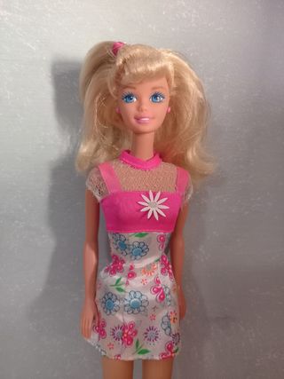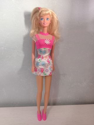 Bambola Barbie iconica degli anni '90, con capelli biondi e un vestito colorato. - Vestito rosa e bianco con fantasia floreale. - Dettagli in pizzo. - Scarpe rosa abbinate.