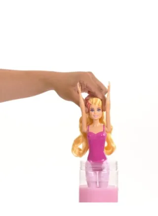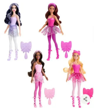 Barbie con tematica di balletto. Include un vestito rosa brillante con tutù, scarpette da balletto rosa, e capelli biondi con sfumature rosa.