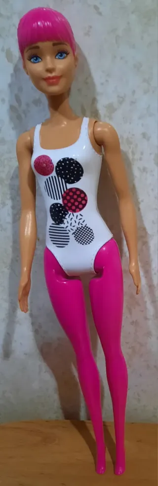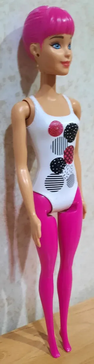 Barbie ballerina di Mattel. - Costume da bagno bianco con design a cerchi. - Leggings rosa. - Capelli rosa raccolti in una coda.