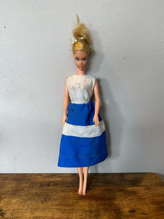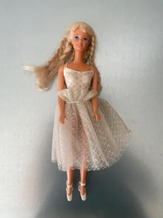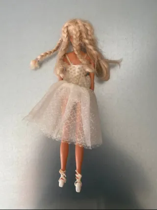 Bambola Barbie ballerina con abito bianco e blu. - Capelli biondi raccolti. - Vestito a due pezzi con gonna. - Dettagli dorati sui capelli.