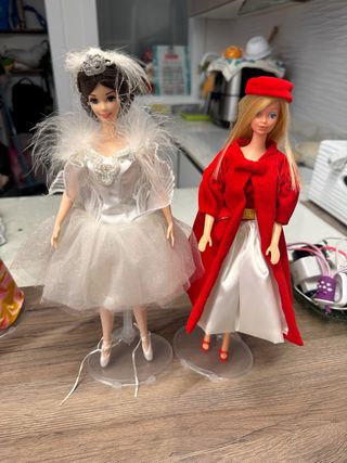 Due bambole Barbie vintage, una in abito da ballerina e una in abito elegante rosso. - Bambola ballerina con tutù bianco e piume. - Bambola con cappello e cappotto rosso, abito bianco e cintura dorata. - Entrambe su piedistallo trasparente.