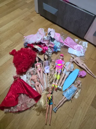 Set di bambole Barbie e accessori. Include varie bambole Barbie di diverse dimensioni. Vari accessori come una borsa e figure piccole. Tutto a 10€. Se ne volete solo una, 3€.