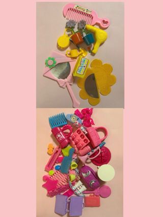Include pettini, asciugacapelli giocattolo, specchi e altri accessori, radio, tromba, borse...