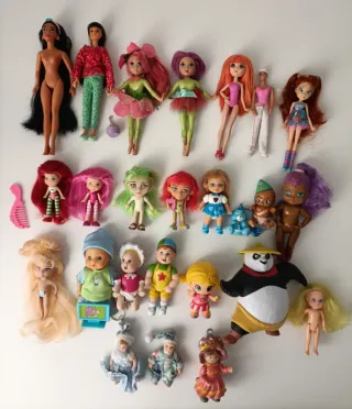 Lote indivisibile, non negoziabile. Include: Mini Cicciobello di Giochi Preziosi, Winx Club, Petal Pixies Barbie Fairytopia (una con capelli tagliati), Barbie McDonald's, Jasmine di Aladdin, Babies di Ideal, Torta di fragole, Baby Secrets Party Babies, Lego Scala 1999, Parfumelles Giochi Preziosi, Wish World Kids 1987 Kenner, Hugs & Kisses Hasbro, Magic Merbabies, Kung Fu Panda Burger King, Pin y Pon moderna, ecc.