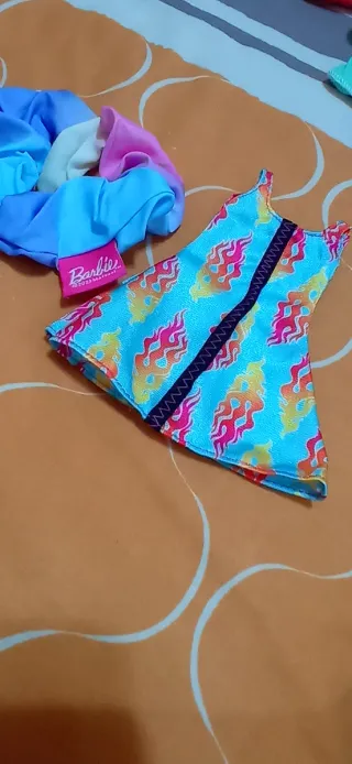 Set di vestiti e accessori per bambole Barbie. - Due top: uno arancione con stampa a quadri e un altro verde. - Pantaloni a campana a quadri in rosa e viola. - Un tubetto di gloss con piume rosa.