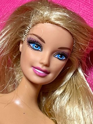 Tre bambole Barbie vintage Mattel, prodotte nelle Filippine. Sono nude e presentano i classici capelli biondi. - Bambola 1: capelli biondi lunghi, treccia con nastro blu. - Bambola 2: capelli biondi lunghi, sciolti. - Bambola 3: capelli biondi corti, raccolti.