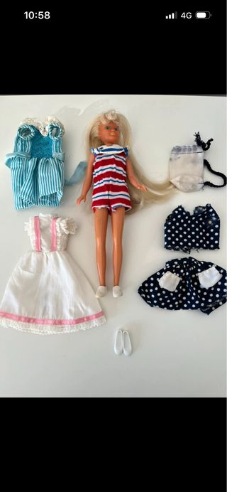 Conjunto di bambole Barbie Skipper di Congost con vari abiti. - Bambola Barbie Skipper Spagna - Vestito a righe rosse e bianche. - Vestito bianco con dettagli rosa. - Completo blu a righe. - Completo di gonna e top a pois. - Scarpe bianche.