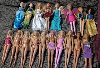 Lotto composto da diverse bambole Barbie, ognuna con abiti e accessori unici. - Bambole con capelli biondi e acconciature diverse. - Abiti colorati e alla moda. - Dettagli curati nei vestiti e negli accessori.