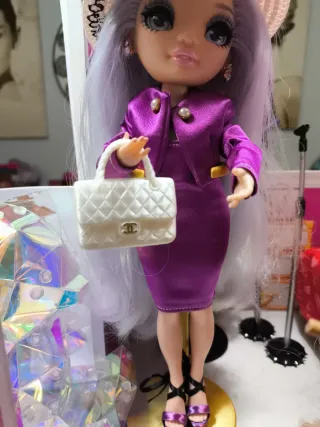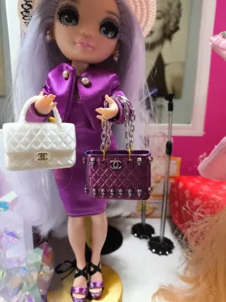 Borsa bianca imbottita con catena dorata e logo Chanel. Scarpe bianche con fiocco colorato. Ideale per bambole. Borsa bicolore viola e scarpe abbinate. 3€ per borsa o scarpe. Prezzo economico per ordini superiori a 10 unità. Realizzati in stampa 3D. Dettagli dipinti a mano. Design elegante e alla moda. Finitura imbottita. Manico a catena.