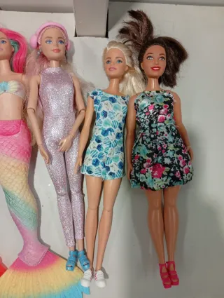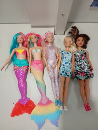 In vendita lote di 5 bambole Barbie, tra cui sirene e altre. Ref5 - Barbie sirena con coda viola e top giallo. - Barbie sirena con coda arcobaleno e top di conchiglie. - Barbie con costume brillante e cuffie. - Barbie con vestito blu stampato. - Barbie con vestito floreale nero.