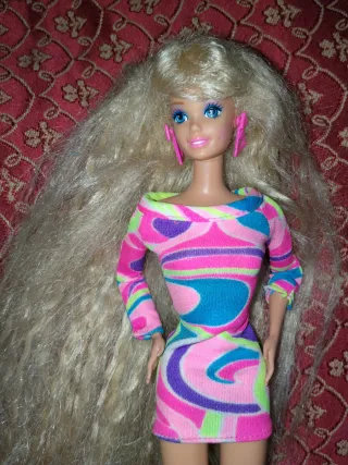 Iconica Barbie con lunghissimi capelli biondi, un vero pezzo da collezione degli anni '90. - Vestito colorato con fantasia astratta. - Orecchini rosa. - Scarpe rosa. Vedi foto, piccolo difetto alla punta del piede, non si nota
