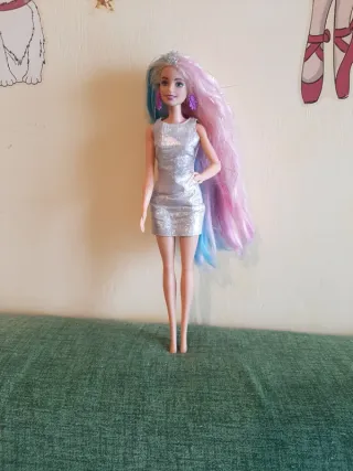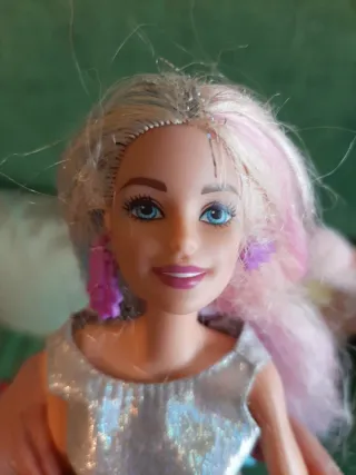 Bambola Barbie capelli arcobaleno Mattel 2015, come in foto. - Capelli con sfumature blu, rosa e bianche. - Vestito argento scintillante. - Orecchini viola.