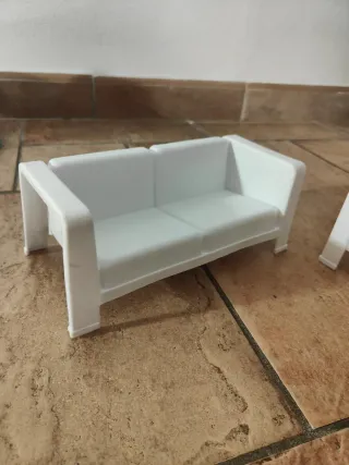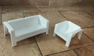 Set soggiorno vintage per Barbie Mattel degli anni '80. Include un divano e una poltrona. - Design bianco. - Materiale plastico.