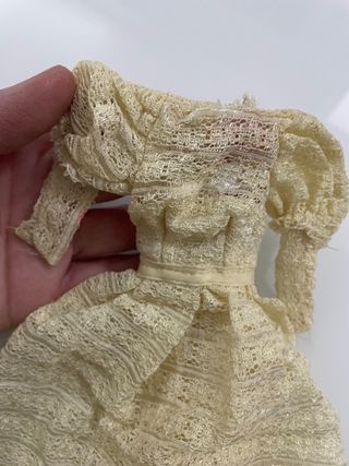 Bellissimo abito vintage per Barbie Mattel, realizzato in pizzo color bianco tenue. Un capo da collezione per la tua bambola. - Tessuto in pizzo con dettagli lavorati. - Maniche a sbuffo. - Cintura in vita. - Gonna ampia.