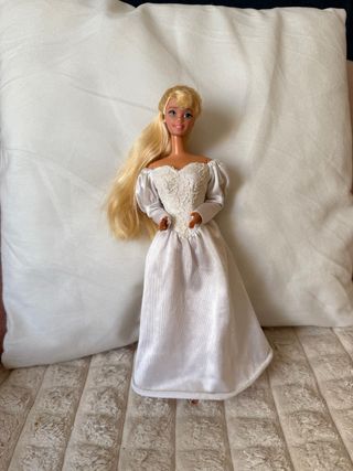 Abito da sposa per Barbie, originale degli anni '90. - Tessuto in raso bianco con dettagli in pizzo. - Include velo e accessori. - Finiture con perline e fiorellino rosa. Barbie esclusa