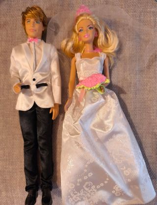Set di sposi Barbie e Ken con abiti da sposa. Di Mattel. - Ken indossa un abito bianco satinato con papillon rosa. - Barbie indossa un abito da sposa bianco con velo e mazzo di fiori. Scarpe rosa. - Include accessori.