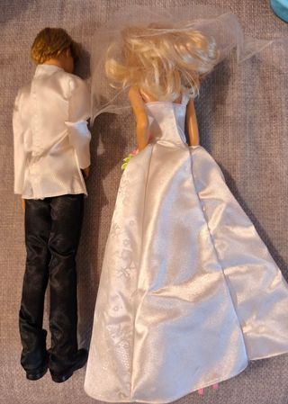 Abito completo da sera per Ken e abito con velo per Barbie. Gli stivali di Ken sono entrambi presenti, ma uno di Barbie manca. Il pantalone è stato ricucito per il mio gioco. Sono degli anni '90 e sono in ottime condizioni.