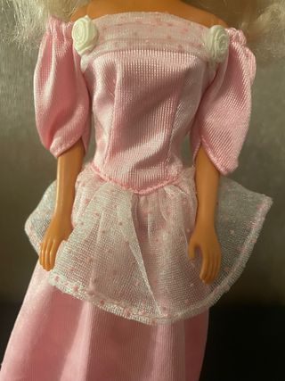 Abito Barbie della collezione Bridal del 1999. Un design da sposa in tonalità rosa. - Abito lungo in raso rosa. - Dettagli in pizzo sul corpetto e sulla gonna. - Fiori decorativi sulle spalle. - Include diadema abbinato. Le scarpe non sono originali. L'ultima foto è a scopo illustrativo. Barbie non inclusa.