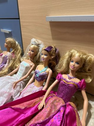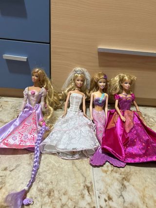Se ne volete una separatamente, fatemelo sapere e creerò l'annuncio. Set di 4 bambole Barbie con abiti diversi. - Una bambola con abito lungo viola e treccia. - Una bambola da sposa con velo. - Una bambola sirena con top blu e coda. - Una bambola con abito lungo rosa e arancione.