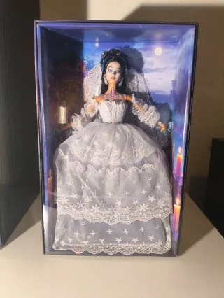 Bambola Barbie edizione speciale Día de Muertos, ispirata a La Llorona. - Abito da sposa bianco con dettagli in pizzo. - Trucco a tema calavera. - Scatola da collezione con arte frontale.