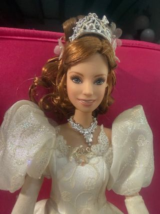 Barbie della Collezione Incantata 2007, modello Giselle versione Matrimonio del 2007. Indossa un elegante abito da sposa. - Abito bianco con dettagli ricamati. - Include tiara e collana. - Maniche svasate.