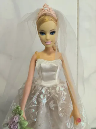 Barbie in abito da sposa, pronta per il suo grande giorno. Include una splendida tiara. - Abito bianco in pizzo e tulle. - Tiara argentata. - Braccialetti dorati.
