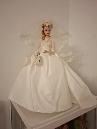 Barbie riedizione degli anni '60, vestita da sposa. Include: abito bianco in pizzo con dettagli brillanti, velo di tulle, collare e diadema. Bouquet e legaccio inclusi, appena uscita dalla scatola.