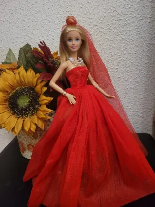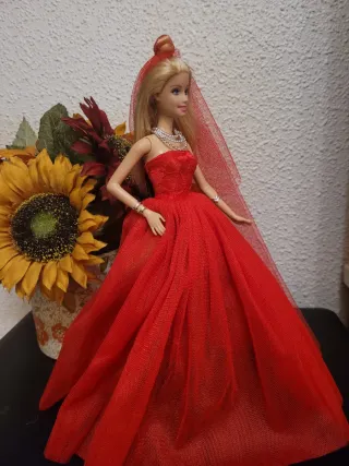 Barbie sposa con un elegante abito rosso. - Abito lungo in tulle rosso. - Collana argentata. - Bracciali argentati. - Velo rosso.