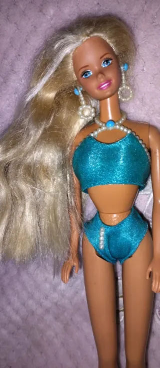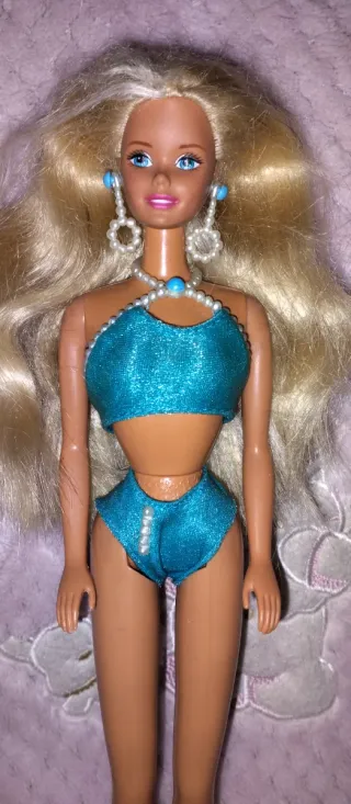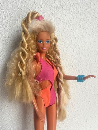 Barbie vintage del 1989, modello Wet'n Wild. Prodotta da Mattel. Design originale del costume da bagno e accessori. Capelli biondi ricci e intrecciati. Le foto fanno parte della descrizione, in ottime condizioni per l'età.