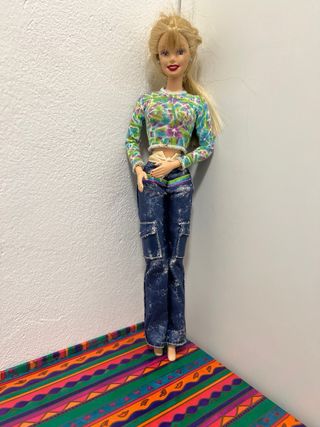 Barbie con maglietta stampata e jeans scoloriti. Mattel Cina 1991. La bambola è una Barbie Tie Dye Fun del 1991 prodotta da Mattel. Presenta il popolare volto 'Mackie'. Viene con un abito con stampa tie-dye dai colori vivaci.