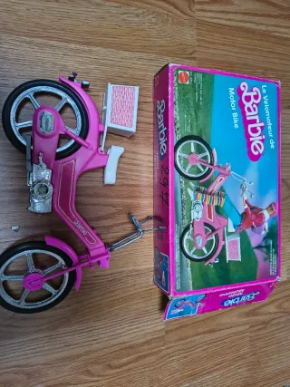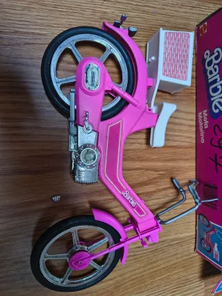 Un classico motorino Barbie vintage, perfetto per collezionisti. Barbie motor bike vintage Piccolo difetto visibile in foto. Vendo quanto visibile - Colore rosa vivace. - Dettagli argentati sul motore e sul manubrio. - Cestino anteriore in vimini rosa. - Ruote con cerchioni argentati.