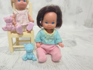 Set di due bambole Baby Barbie vintage. Include due orsetti. - Bambola con vestito rosa e orsetto rosa. - Bambola con maglione blu e pantaloni rosa, e orsetto blu.