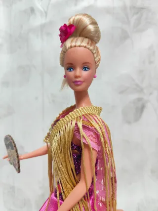 Barbie in a flamenco dress with a pink outfit and golden details. - Long dress with ruffles. - Shawl with golden fringes. - Includes fan.